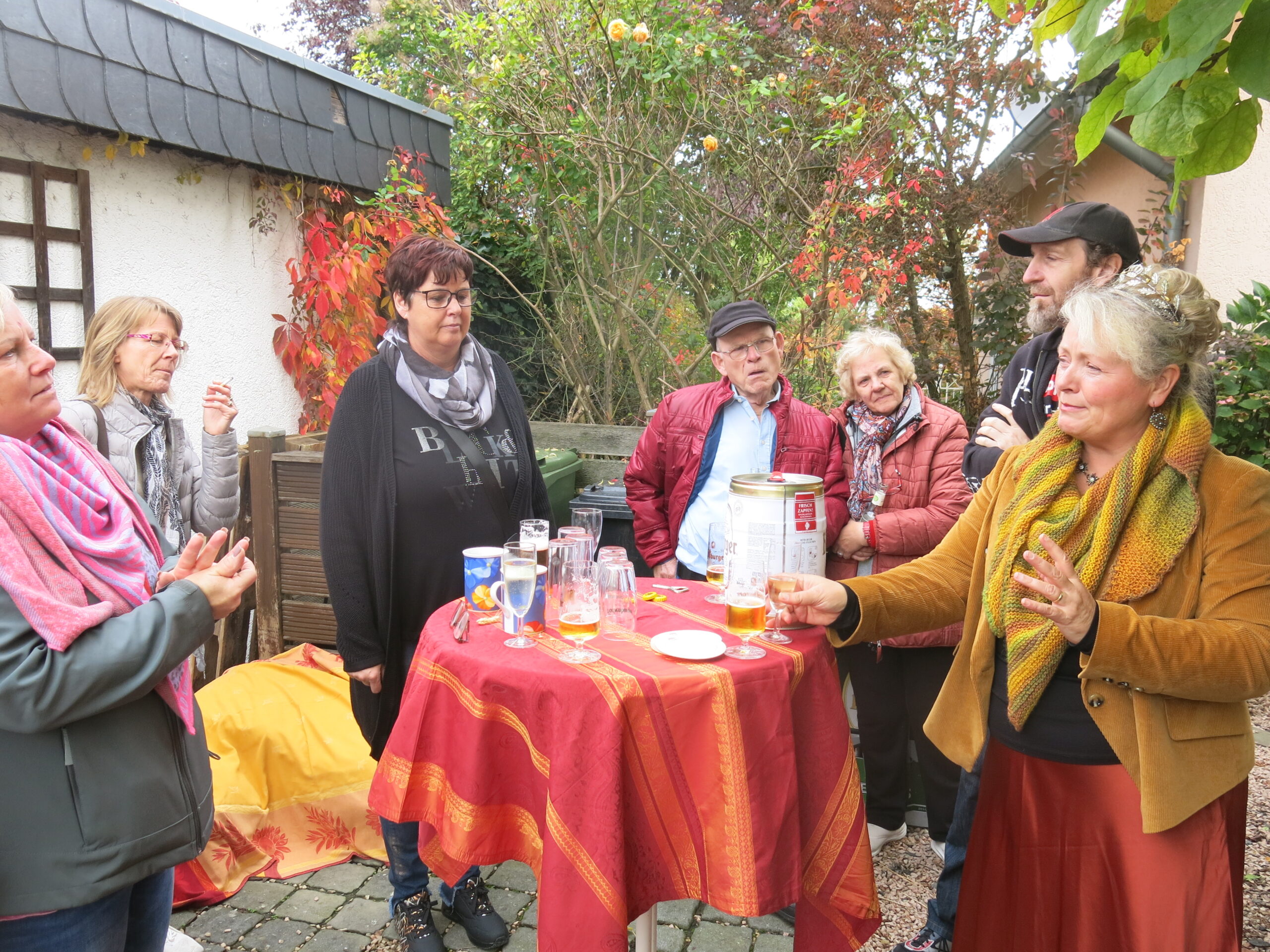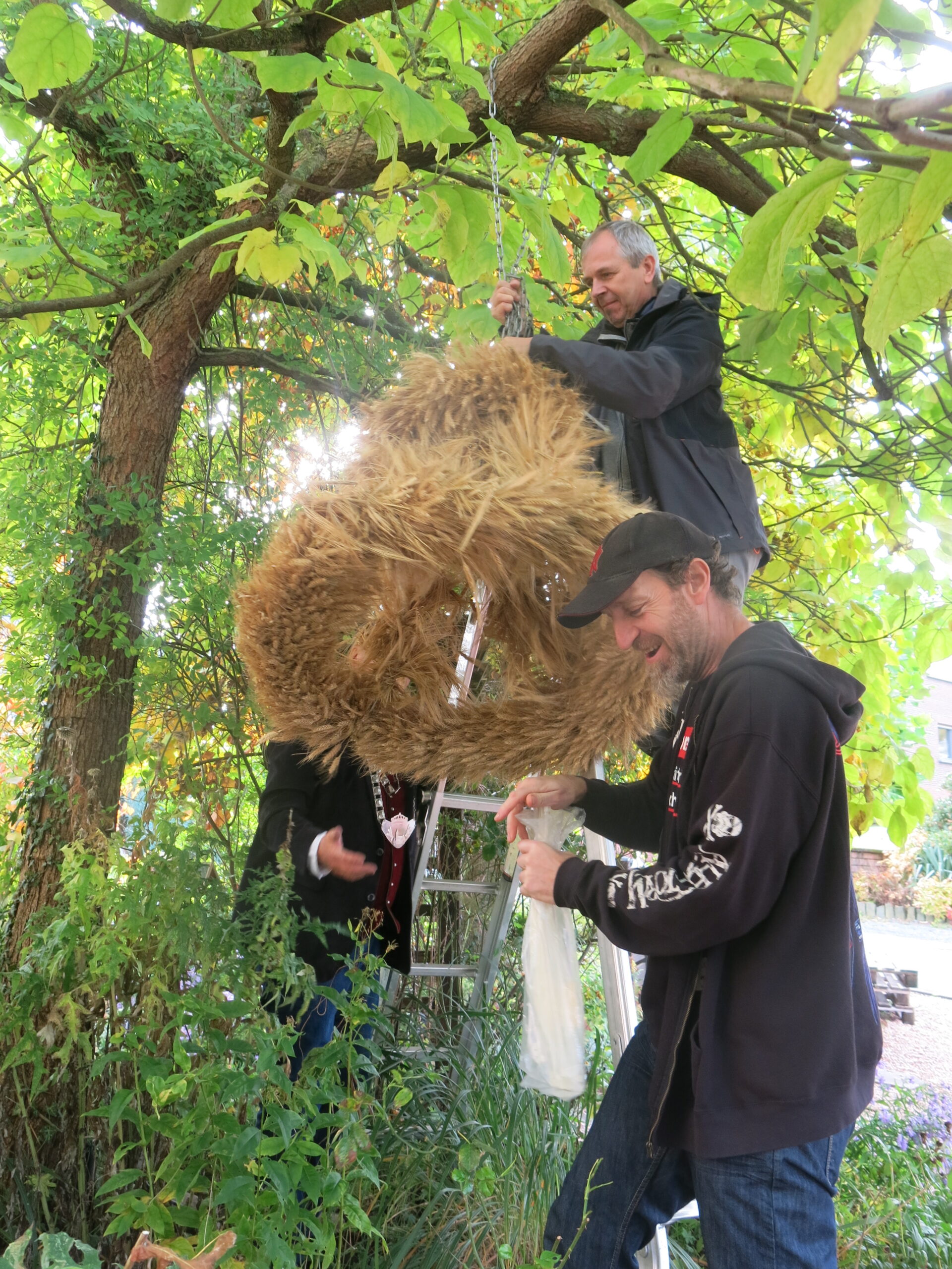 Das geschah am Sonntag der nächsten Woche. Nach dem traditionellen Besuch des Erntekönigspaares gemeinsam mit dem fast kompletten Vorstand des Bürgervereins im Erntedankgottesdienst der Pfarrgemeinde ging es zum Wohnhaus der glückstrahlenden Majestäten. Dort hatten sich bei idealem Wetter schon zahlreiche Gäste aus Vereinen, Verwandtschaft und Nachbarschaft eingefunden, um tatkräftig dabei zu helfen, der Erntekrone die richtige Geltung zu verschaffen. Nach getaner Arbeit musste man natürlich ausgiebig den vom Königspaar bereitgestellten Stärkungen zusprechen. Wann die letzten Gratulanten die Residenz verließen, entzieht sich ehrlich gesagt der Kenntnis des Chronisten. Ekkehart Klaebe
