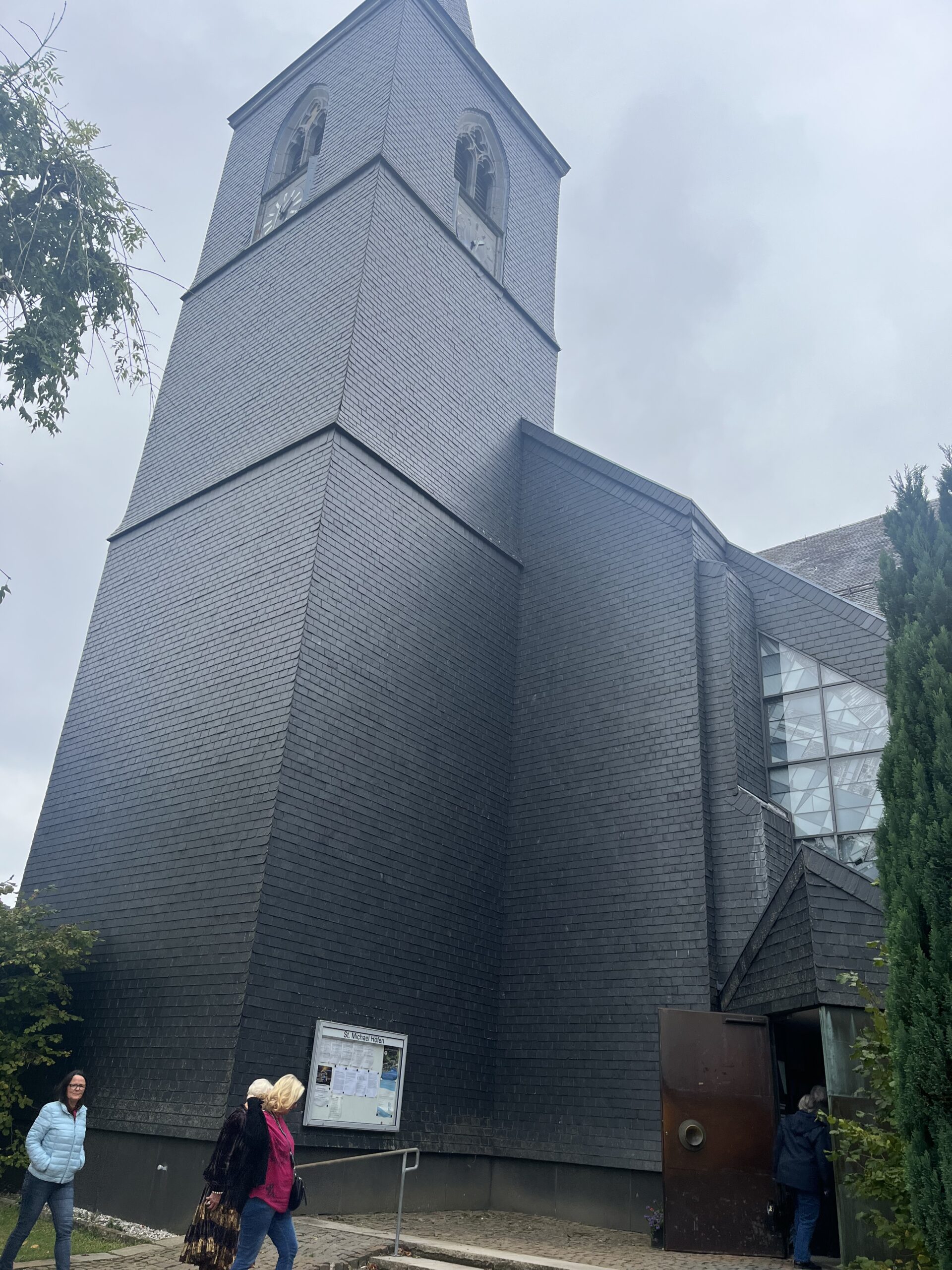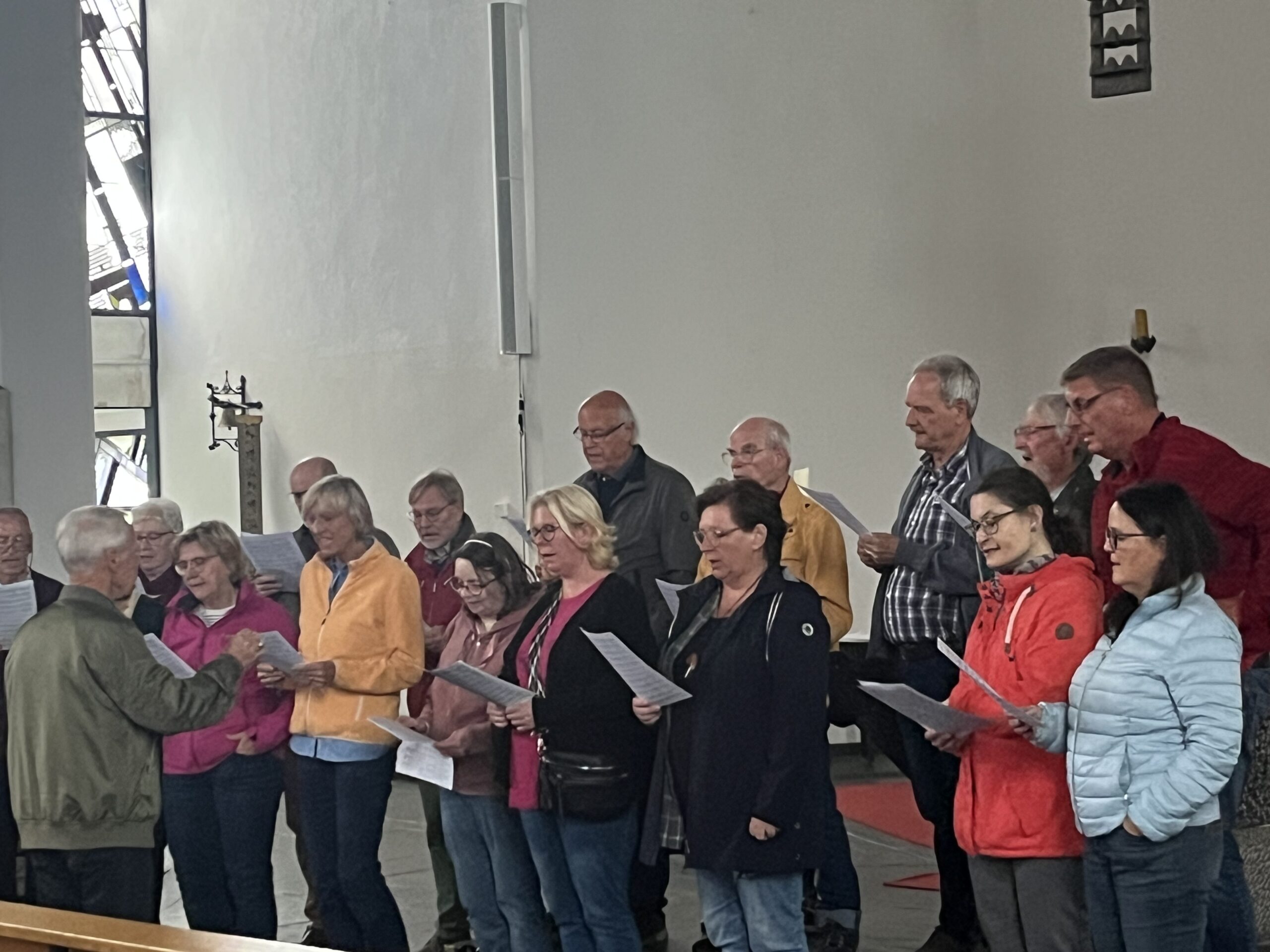 Im Restaurant „Zur alten Molkerei“ in Monschau-Höfen wurden die Ausflügler danach schon erwartet. Da die gewünschten Speisen vorab ermittelt waren, ging es dort schnell zur Sache. Spezialitäten wie das Eifeler Landbier mundeten sehr gut. Eine passende Grundlage für den anschließenden kurzen Chorauftritt war gelegt. Mit drei Liedern unter dem Dirigat von Willi Winterscheidt erfreuten die Sängerinnen und Sänger in der Pfarrkirche St. Michael in Höfen ihre Mitreisenden. Die Kirche, die architektonisch in den 70 ‚er Jahren geschickt erweitert worden war, unterstützte mit ihrer guten Akustik den Gesang.