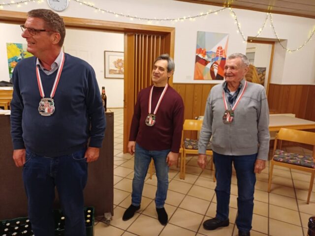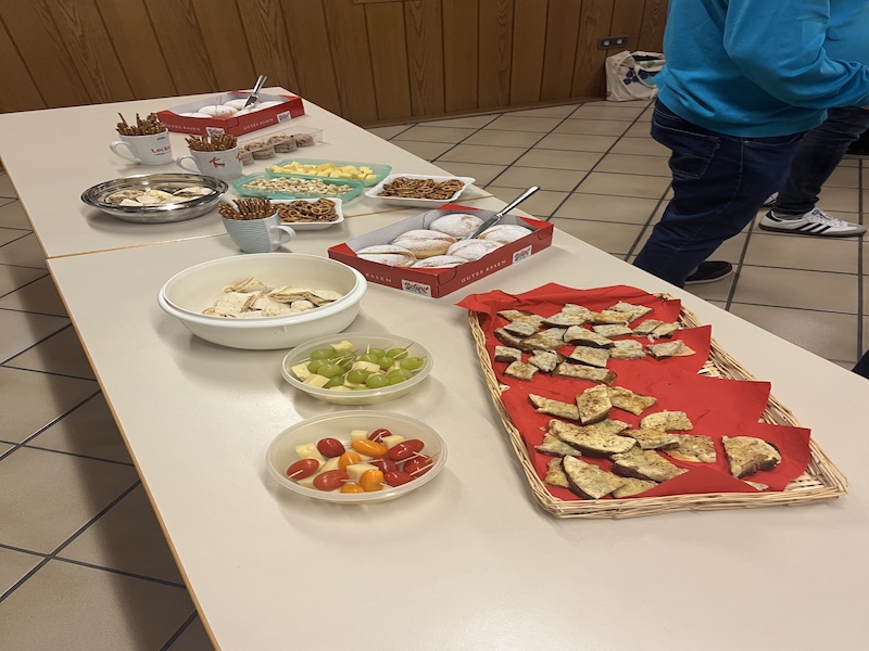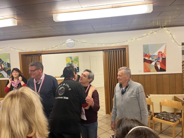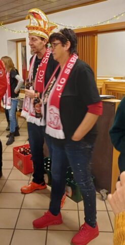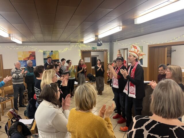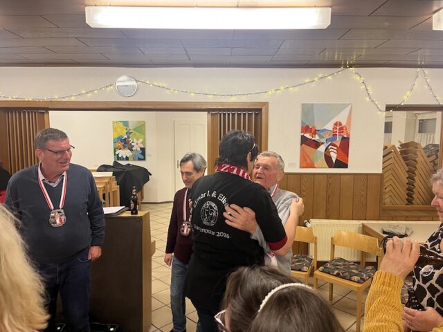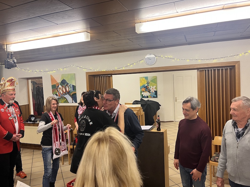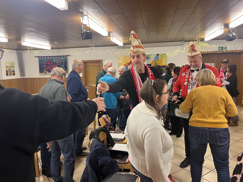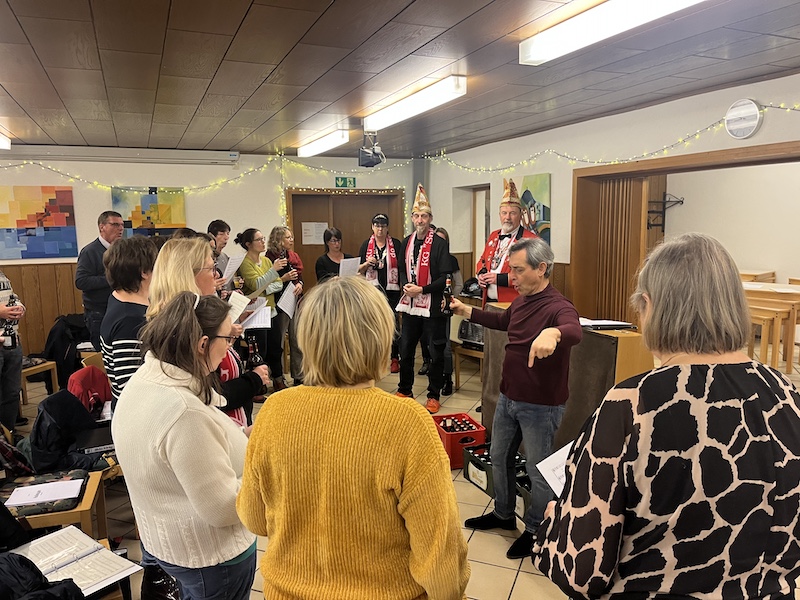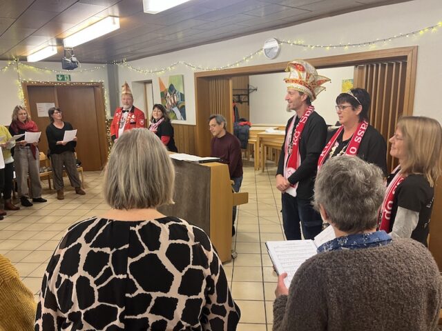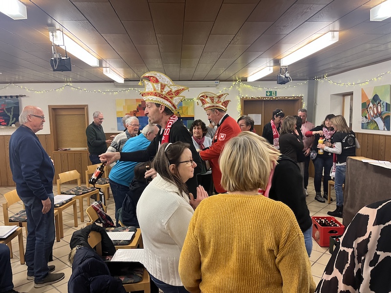 Über 30 Sängerinnen und Sänger empfingen die Tollitäten und ihre Adjutantinnen dann auch mit tosendem Applaus. Natürlich waren einige Lieder vorbereitet und erklangen zur großen Freude der Gäste. Angesichts des verhangenen Himmels der letzten Tage erhellte der Gassenhauer „Loss de Sonn erinn“ schnell die Gemüter. Das dreimal „Hoch“ galt dem Prinzenpaar, stimmungsvoll wurde es mit dem berühmten „Halleluja“ von Leonhard Cohen in kölscher Version. Und mit vertrauten kölschen Tön endete auch der kleine Chorvortrag mit dem Stammbaum der Bläck Fööss, das die KG Abordnung kräftig mitsang. Der Dank ließ nicht lange auf sich warten, zunächst gab des den Prinzenorden für die Chorprominenz und dann die Buttons für alle Sängerinnen und Sänger selbstverständlich spendierten die Gäste noch leckeres Kölsch und Pils. Die Chormitglieder ihrerseits waren mit einem kleinen Imbiss mit von der Partie! Mit dem Austausch über die bisherige Session und die weiteren Veranstaltungen endete der diesjährige Empfang im Pfarrer-Johannes-Hertel-Saal im Pfarrheim! Bis zum nächsten Jahr…